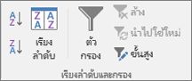 - บนแท็บ ข้อมูล (Data) ในกลุ่ม เรียงลำดับและกรอง (Sort & Filter) ให้คลิก เรียงลำดับ (Sort)
