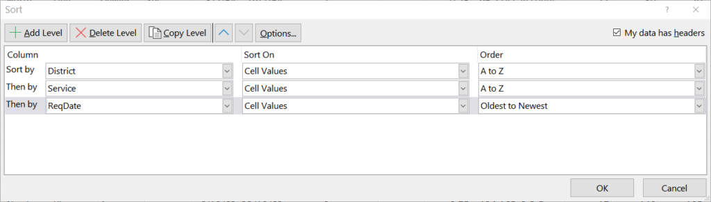 ด้านบนหน้าต่างนี้ จะมี Add Level (เพิ่มระดับ) | Delete Level (ลดระดับ) | Copy Level (สำเนาระดับ)| ลูกศรชี้ขึ้น | ลูกศรชี้ลง | Options (ตัวเลือก) และ My Data has Headers (ข้อมูลมีหัวตาราง) – ซึ่งแนะนำให้ติ๊กเครื่องหมายถูกที่ตัวนี้ จะได้จัดการง่าย ๆ จากชื่อคอลัมน์ที่ตั้งไว้ ไม่อย่างนั้นจะกลายเป็นคอลัมน์ A B C D ซึ่งเราอาจจะจำไม่ได้ว่าเป็นคอลัมน์อะไร