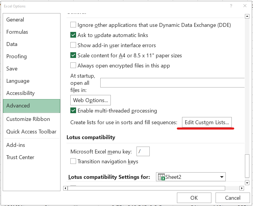 ไปที่ ไฟล์ > ตัวเลือก > ขั้นสูง > เลื่อนลงมาดูตรงส่วน ทั่วไป > แก้ไขรายการแบบกำหนดเอง